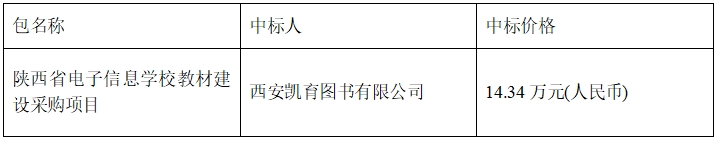本招標(biāo)項(xiàng)目陜西省電子信息學(xué)校教材建設(shè)采購項(xiàng)目(招標(biāo)項(xiàng)目編號:【KRDL】K1-2404043),確定001陜西省電子信息學(xué)校教材建設(shè)采購項(xiàng)目的中標(biāo)人如下: